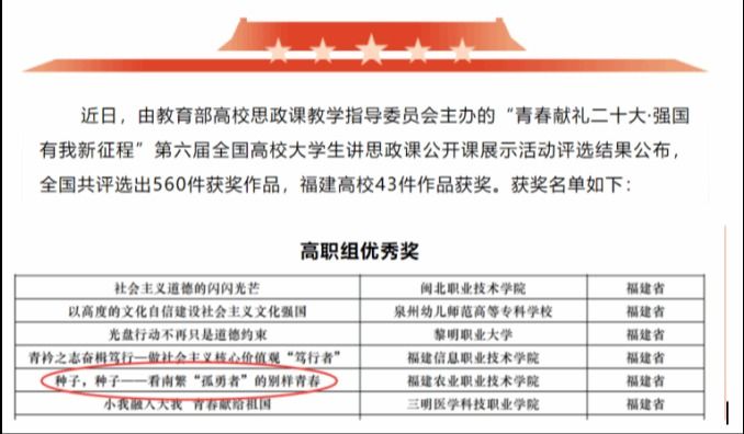 近期,马克思主义学院“以赛促学、以研促学”思想政治理论课教科研工作再获佳绩。之一:在教育部高校思政课教指委举办的第六届全国高校大学生讲思政课公开课展示活动中,马克思主义学院叶玉华老师指导,陈思远、黄铵伟、赖景霖,蔡炜铭,傅天鸿,肖骏等同学参加的思政微课《种子,种子——看南繁“孤勇者”的别样青春》荣获全国高职组优秀奖。微课讲述了国家南繁科研育种基地一代代农科人为国育种的故事,引导广大青年心怀国之大者,...