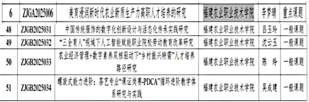 近日,从福建省职业技术教育中心发布的《关于2025年福建省职业教育研究课题立项名单的通知》获悉,我院共有5个课题立项,其中重点课题1项,一般课题4项,具体名单如下:课题聚焦农业特色、数字赋能、育人改革等关键方向,紧密结合新时代职业教育发展需求与乡村振兴战略要求。下一步,我院将严格按照课题研究规范,为立项课题提供充足的资源支持与保障,推动课题研究落地见效,以高质量科研成果助力职业教育内涵提升,为培养更多适应农业农村发展的高素质技术技能人才贡献力量。...