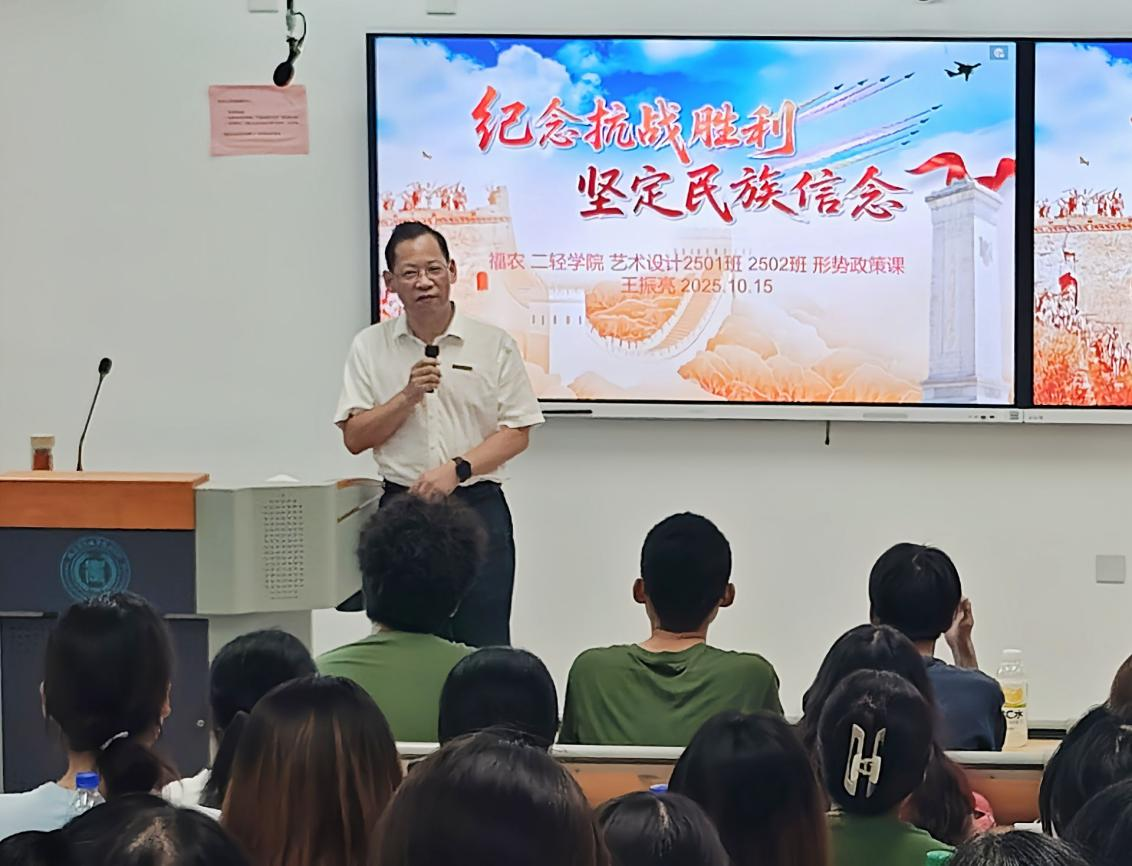 10月15日下午,学院党委副书记王振亮在动科楼603教室为二轻学院艺术设计2501、2502班学生讲授《纪念抗战胜利 坚定民族信念》专题思政课。王振亮围绕“铭记历史,正义必胜”“民族壮举,浓墨重彩”“精神丰碑,永不磨灭”“珍爱和平,开创未来”四个维度,以14年抗战历史脉络为主线,清晰梳理了从“九一八事变”到日本宣布无条件投降的关键历程,结合百团大战、豫湘桂战役等重要战役,深入剖析中国共产党在抗战中发挥的中流砥柱作用,...