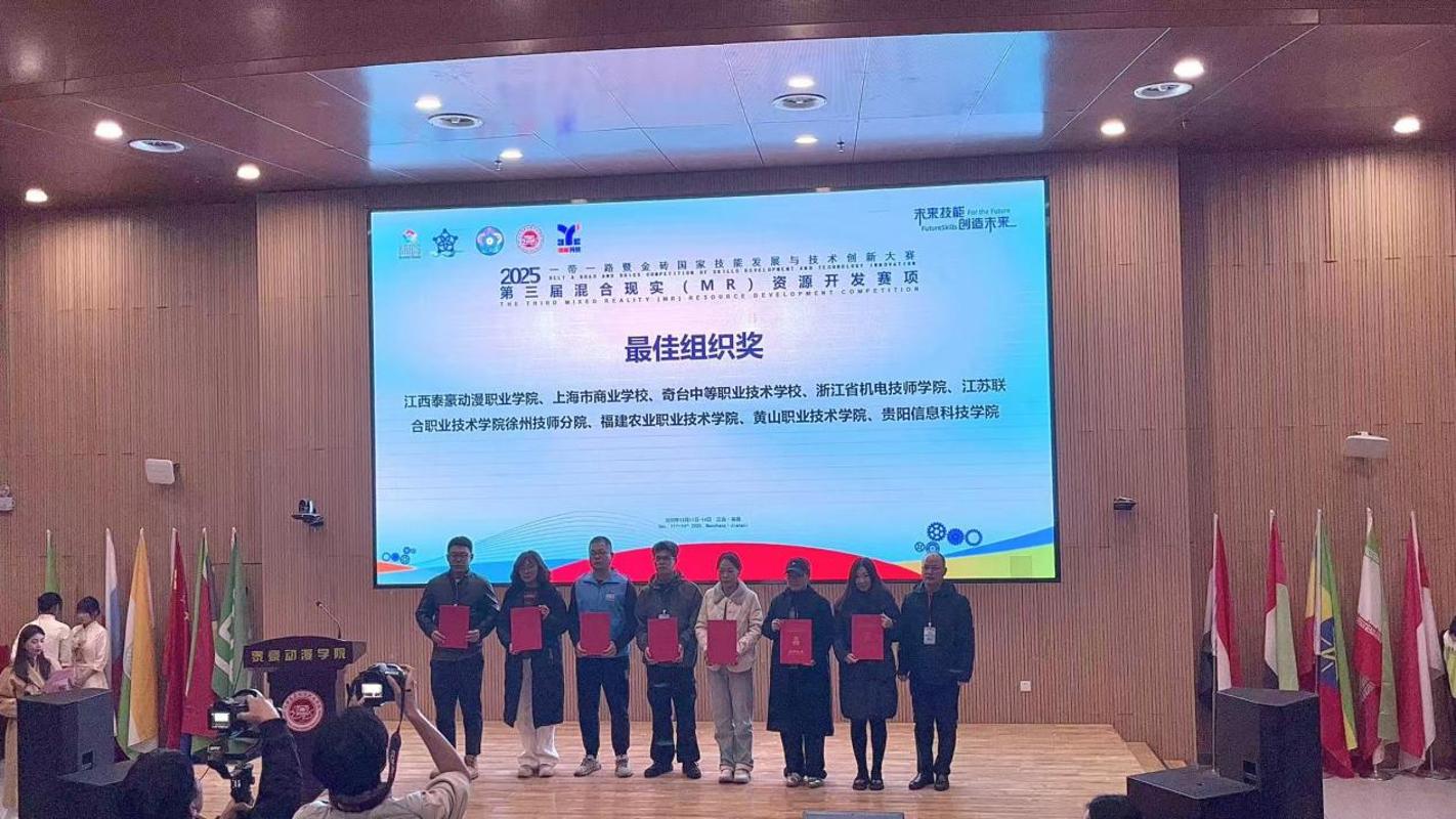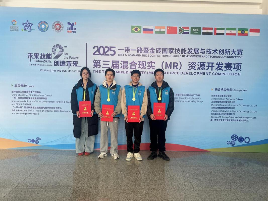 近日,2025年“一带一路”暨金砖国家技能发展与技术创新大赛第三届“混合现实(MR)资源开发”赛项全国总决赛圆满落幕。福建农业职业技术学院信息工程学院学子不负众望,由黄君君、邓丽萍两位老师指导的2支参赛团队(蔡琰杰、胡潇文、杨志祥、李宗凯)凭借扎实的专业功底与创新的技术应用,双双斩获国赛一等奖(金牌);学院荣获“最佳组织奖”,2位指导教师获评“优秀指导教师”。