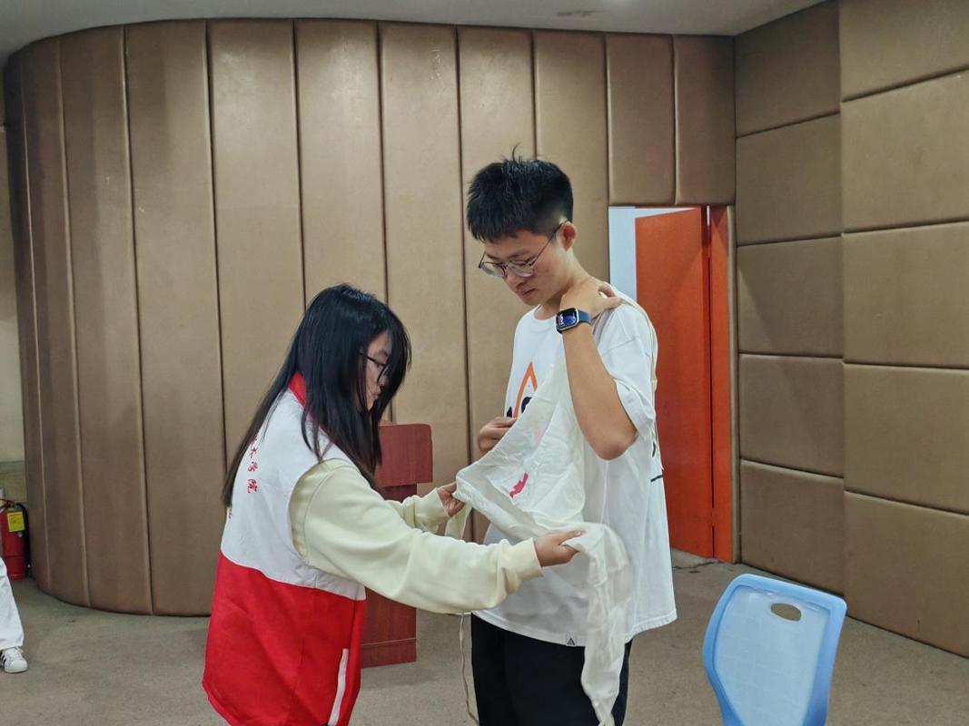 活动现场,“青盾”禁毒宣讲团的志愿者先是向同学们介绍了各式各样的毒品种类及预防措施,又通过生动的案例讲解和实操演示,向同学们传授了心肺复苏、海姆利希急救法、绷带包扎以及三角巾包扎等关键急救技能。志愿者详细讲解每项技能的操作要点,并结合实际案例,让同学们理解急救知识在生活中的重要性。