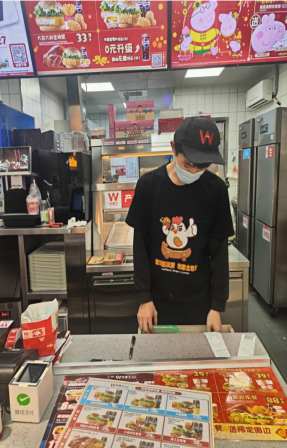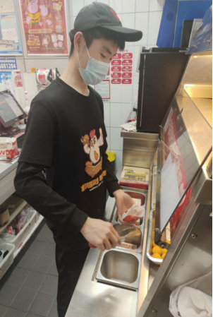 徐星星于厦门市海沧区兴港六里华益士门店,开展了为期一个半月的打工实践。在后厨岗位,他负责鸡排、鸡腿等食品炸制工作,从最初的手忙脚乱到后来的高效作业,有效锻炼了自身耐心与执行力;转战饮品区,他专注奶茶、咖啡等饮品制作,严格把控原料配比与出品时间,养成了“多问多看、细致严谨”的工作习惯;在前台收银岗位,他承担点单、收银、出餐等工作,从容应对客流高峰期的繁忙场景,显著提升了抗压能力与多任务处理能力。这段实践经历,让他深刻体会到每一份职业都有其价值、每一分收获都来之不易,更明白了责任与担当的意义,学会以认真态度对待每一项工作,懂得珍惜校园学习机会,为未来发展筑牢基石。