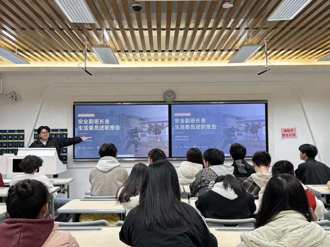 述职环节中,各班委依次上台汇报工作。团支书率先从团支部建设,团日活动开展、团员思想引领等方面总结成果;学委兼体委聚焦学业管理与体育活动组织,分析班级学习情况并提出学习帮扶计划;文娱委员、组织委员、宣传委员则分别就班级文化活动策划、团日活动组织、班级宣传工作进行详细阐述;二课副班也针对第二课堂管理,介绍了服务同学的具体举措。各班委既客观展示了本学期的工作实绩,也坦诚剖析了工作中的不足,并结合班级实际提出了改进方向与下一阶段的工作规划。