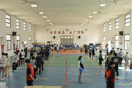 8点时分,核酸检测现场布置完毕,一切准备就绪。在志愿者的引导下,全校师生分时分批来到各采样点,依次入场,保持一米间距的队形,井然有序的参加检测。