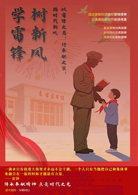 笔墨绘初心,海报传精神。为传承和弘扬雷锋精神,让奉献精神融入青春血脉,我院团委特组织开展“学雷锋,树新风”主题海报征集活动。活动一经发起,便得到全院学子的积极响应与踊跃参与,同学们以创意为笔、以设计为媒,将对雷锋精神的理解与感悟凝于海报之上,每一幅作品都紧扣主题、构思精巧,用鲜明的视觉语言诠释新时代雷锋精神的内涵。经过多方筛选与综合对比,以下作品兼具思想性与艺术性,现将优秀海报作品进行展示。
