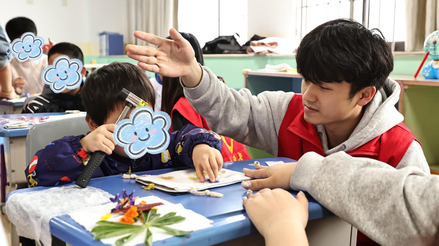 手工体验环节,孩子们在志愿者一对一陪伴下,用小花朵、小绿叶等花草拼出自己喜欢的图案,将春日草木的脉络与色彩定格在素色小布袋上,完成了一件件独一无二的专属手工作品。小朋友们紧紧拿着自己创作好的小布袋,小心翼翼地装入志愿者们提前准备好的甜蜜小糖果,脸上洋溢着纯真又满足的笑容,在动手创作中真切感受自然之美,释放童真活力。过程中,志愿者与孩子们亲切互动、轻声交流,用陪伴与耐心搭建起温暖的沟通桥梁,现场洋溢着欢声笑语与春日生机。