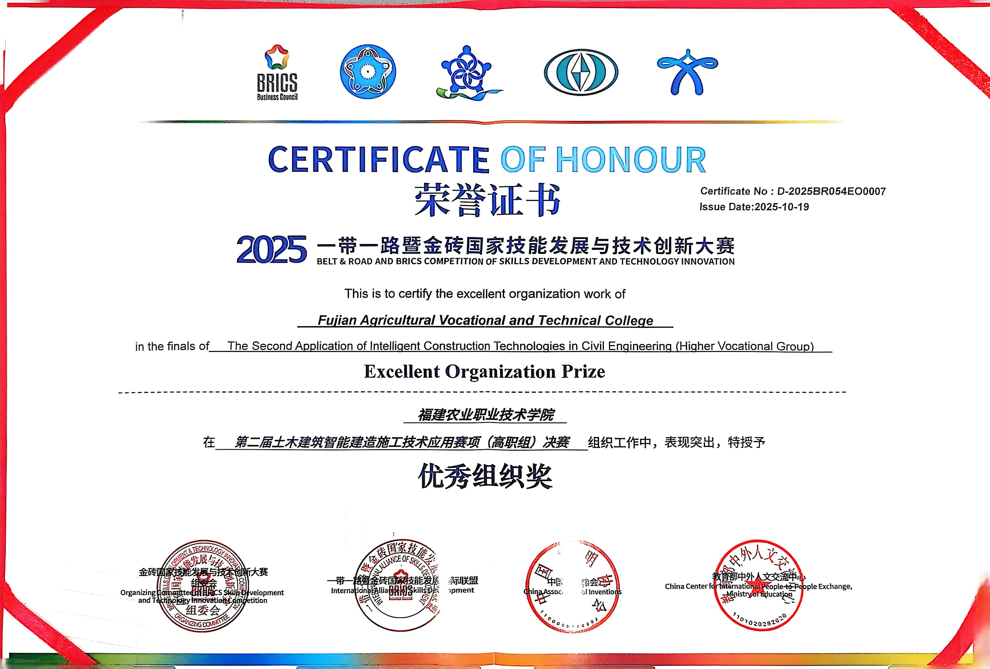 秋深三峡阔,技能展风采。10月17日至19日,2025“一带一路”暨金砖国家技能发展与技术创新大赛第二届土木建筑智能建造施工技术应用赛项全国总决赛在重庆安全技术职业学院落下帷幕。我院学子吴婧钰、刘巧泓在谢敏、张俊腾两位指导老师的带领下,凭借扎实的专业功底、娴熟的实操技能与稳定的临场发挥,从全国298支入围决赛的队伍中脱颖而出,成功斩获国赛二等奖,为学校赢得重要荣誉。同时,我院因出色的赛事组织协调能力,被授予“优秀组织单位”称号,实现“竞赛成绩突破 + 组织工作认可”的双重丰收。