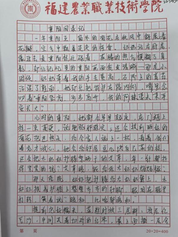 岁岁重阳暖,孝德润人心。为深化新时代青年对中华传统节日文化的认知认同,大力弘扬 “尊老、敬老、爱老、孝老” 的传统美德,落实 “立德树人” 根本任务,2025年10月27日至28日,园艺园林学院团委联合青年志愿者协会以重阳节为重要契机,精心策划并开展 “重阳敬长辈,美德永传承” 主题征文活动。全院学生积极参与,在文字中传递孝亲温情。