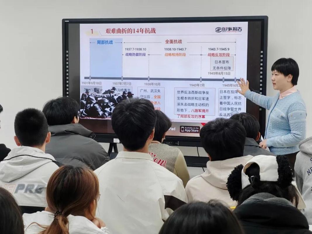 课堂上,吴华副院长以“1945—2025:回望反法西斯战争下的中国与世界”为主线,系统梳理了中国十四年抗战的艰辛历程,并结合近期热播剧《沉默的荣耀》中吴石将军的事迹,生动阐释了革命先辈为民族解放事业展现出的坚定信念与牺牲精神。她还围绕九三大阅兵的国家象征意义、台湾光复背后的民族情感等现实话题,引导学生深刻理解抗战胜利的历史意义与时代价值,激励学生自觉将个人理想融入国家发展,关注时事政策,夯实专业本领,勇担时代使命。
