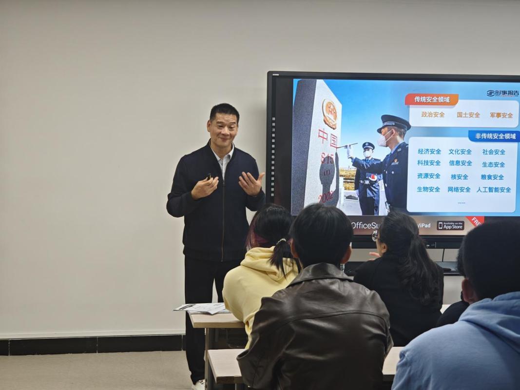 课堂上,陈坛春书记结合党的二十大报告中关于“平安中国建设”的部署要求,从国家安全体系现代化、社会治理创新、公共安全保障等维度展开深入解读。他通过剖析典型案例、展示数据成果,系统阐述了平安中国建设的内涵与成就,并针对校园安全、网络安全等学生关切问题提出具体建议,强调“平安建设人人有责,青年学子既是受益者,更应是参与者”。