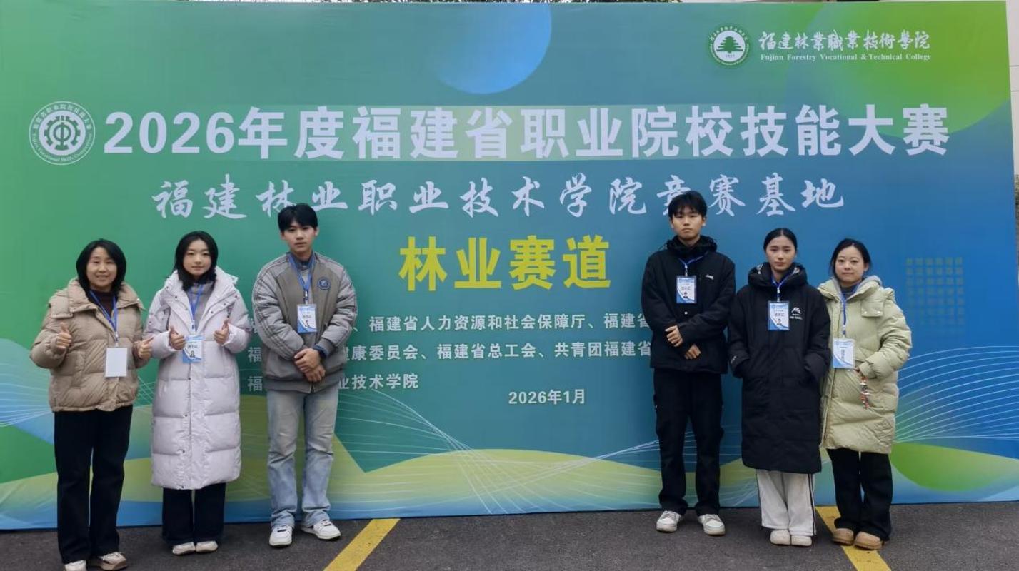 2026年度福建省职业院校技能大赛林业赛道(高职组)于1月5日-8日在福建林业职业技术学院举办,来自全省各地的22支参赛队伍同台竞技。在我院张迎辉、黄丽萍两位老师的专业指导下,宋瑜佳、田佳旭、吴海钒、卢圣韬四位同学组成的参赛团队,凭借扎实的专业功底、娴熟的实操技能和稳定的临场发挥,在全省众多优秀参赛选手中脱颖而出,以小组第二的排名荣获银奖。