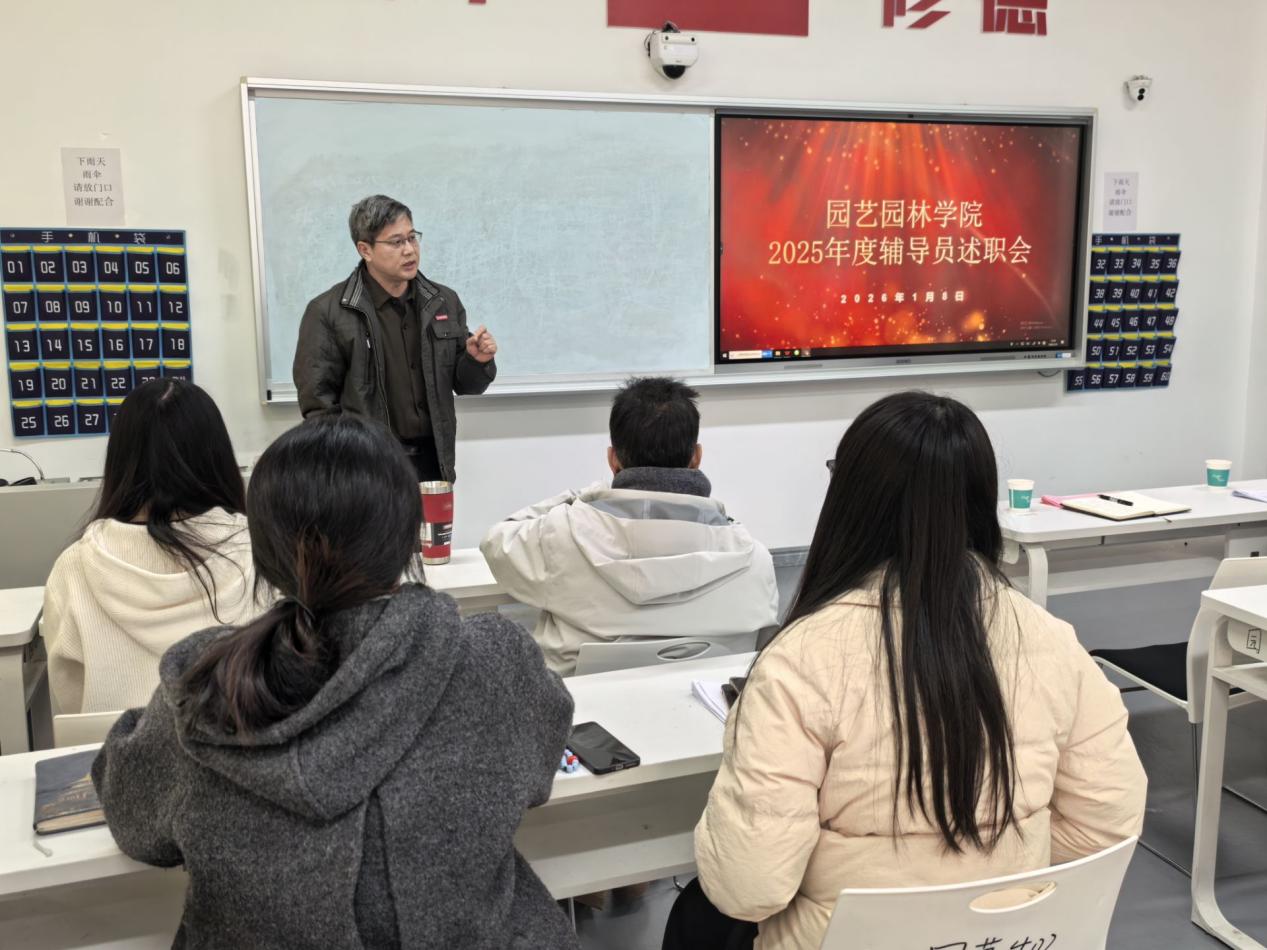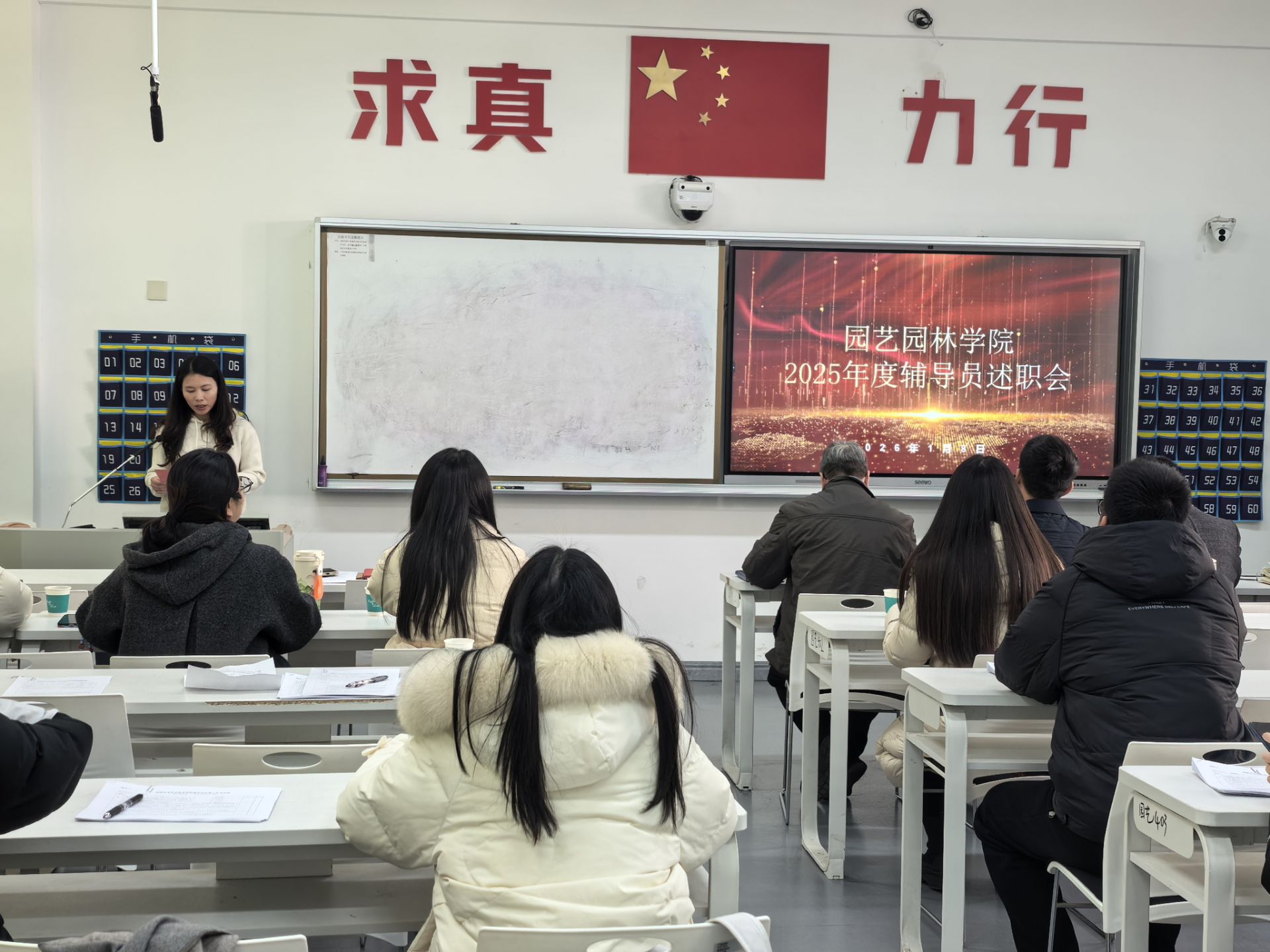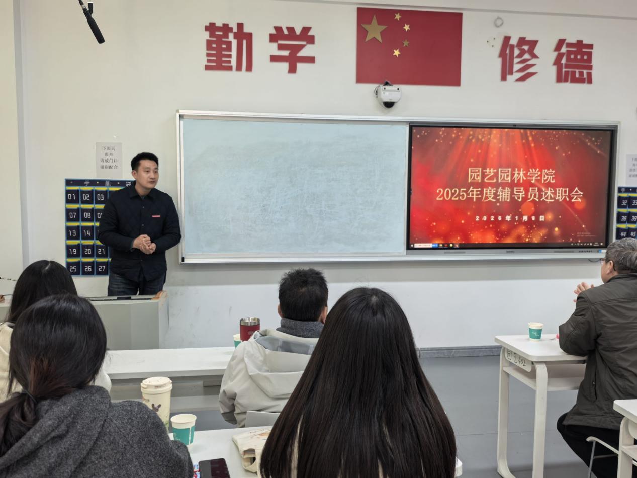 总结育人经验,锤炼过硬本领。学院于2026年1月8日下午在教学2号楼402教室召开2025年度辅导员工作述职评议会,全面总结2025年度学生工作经验,提升辅导员队伍专业化水平。学生工作部蔡思雄老师到会指导,学院党政领导班子成员、全体专职辅导员参加会议,会议由学院党总支副书记李雪宁主持。