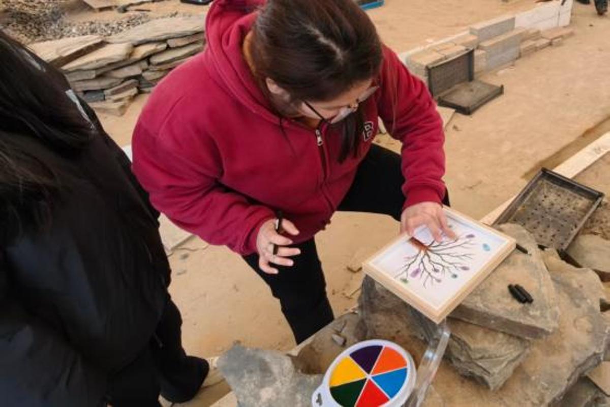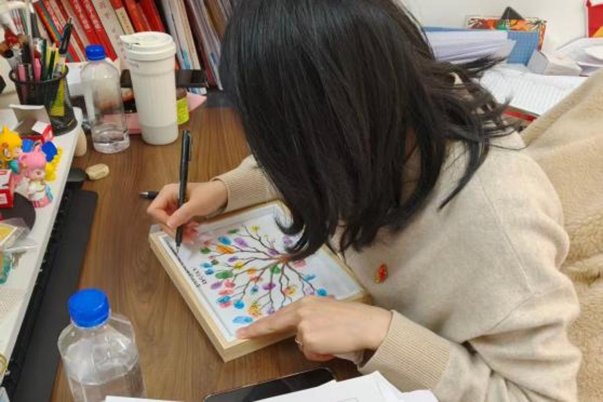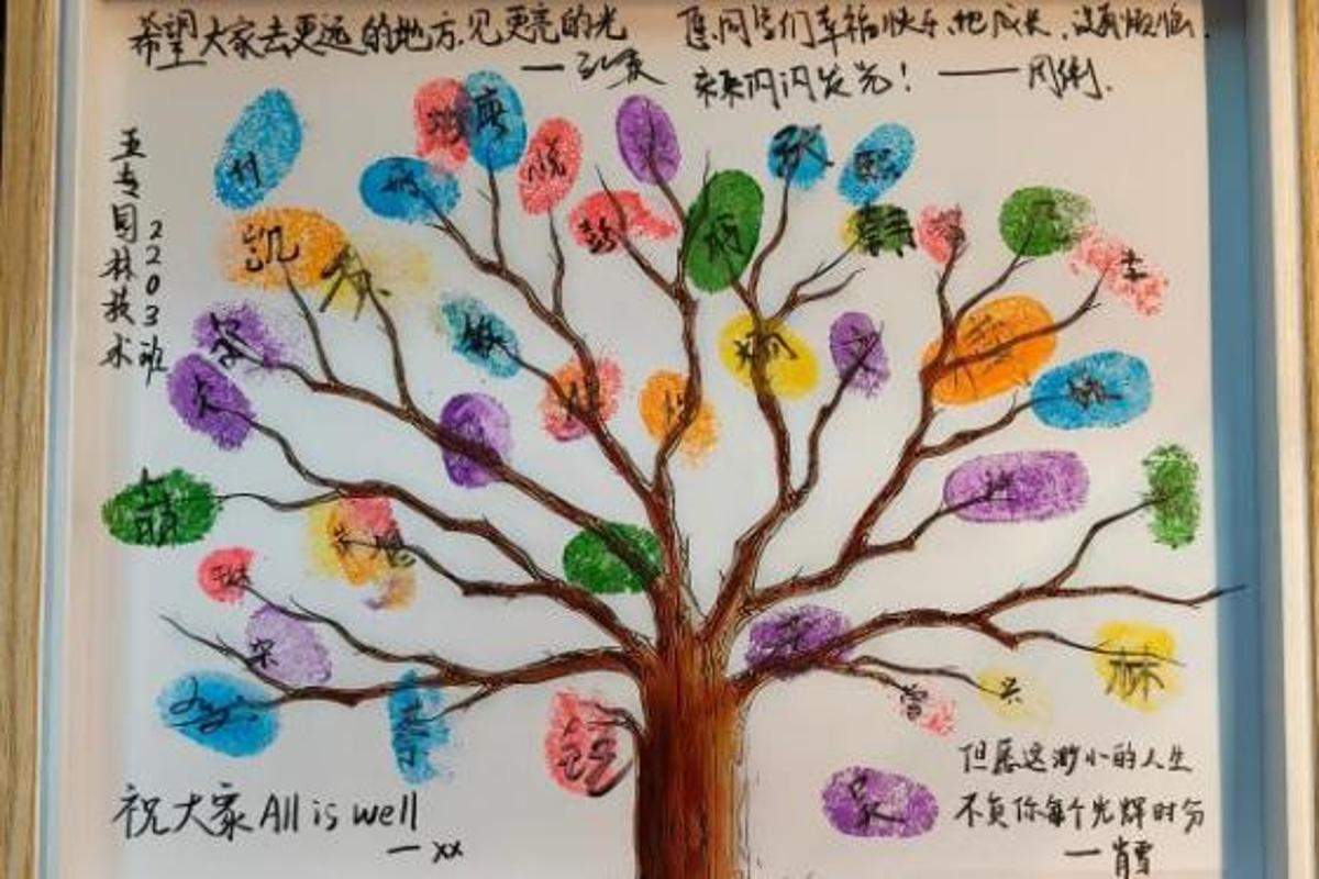 五专园林技术2203班以“一人一印,同心奋进”为主题,开展集体手指画共创,同学们依次绘制指纹,并将“笃行、致远、拼搏”等奋进类词语融入创意设计,写下青春祝语,辅导员与助导也在手绘画上留下寄语,通过协作创作传递团结力量,凝聚起共赴新征程的奋进共识。