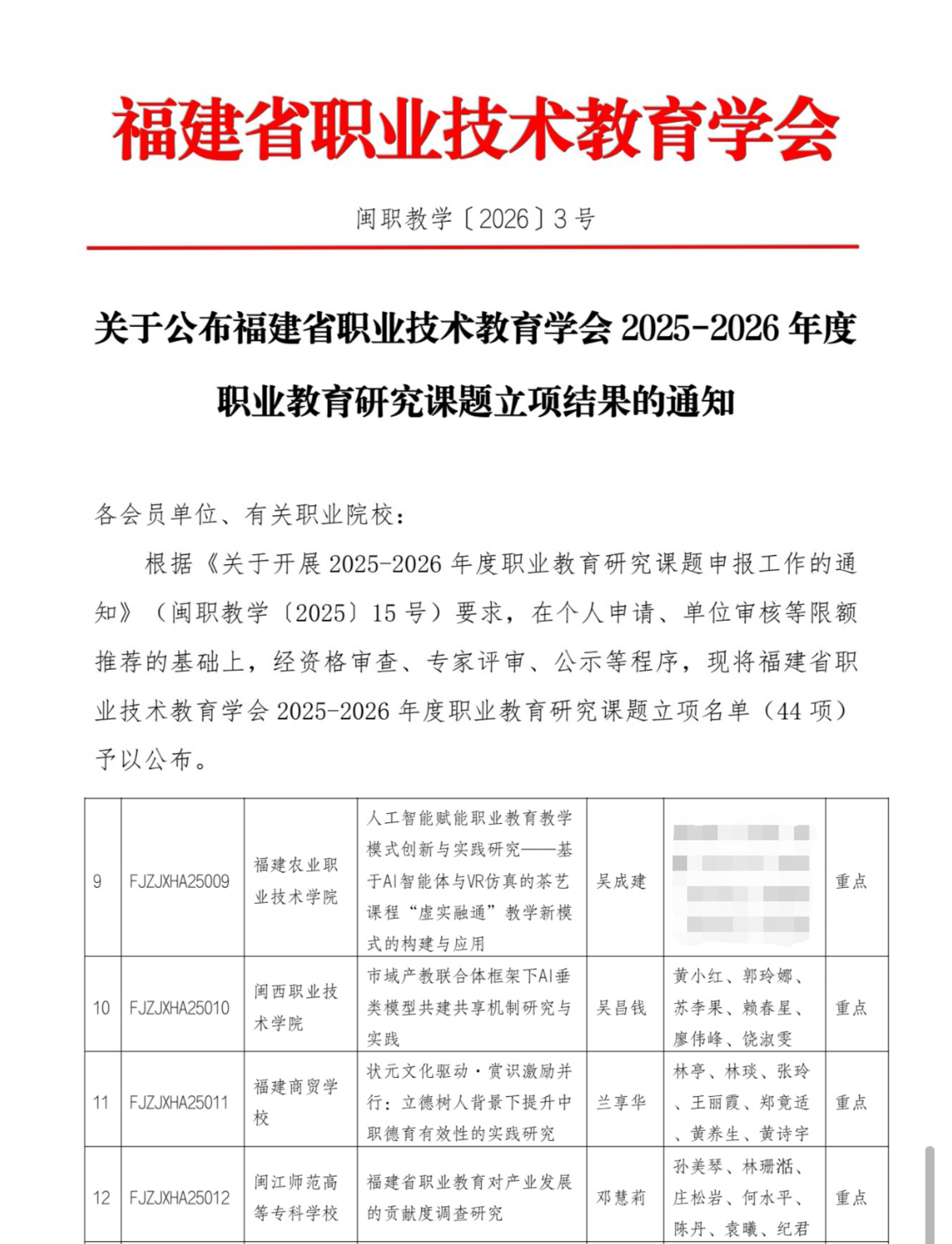 近日,福建省职业技术教育学会公布2025—2026年度职业教育研究课题立项结果。我院吴成建老师主持的重点课题《人工智能赋能职业教育教学模式创新与实践研究——基于AI智能体与VR仿真的茶艺课程“虚实融通”教学新模式的构建与应用》获批立项。该课题成功立项是我院在深化“教学质量提升工程”过程中,持续推进教育教学改革与人工智能融合创新的重要成果体现。