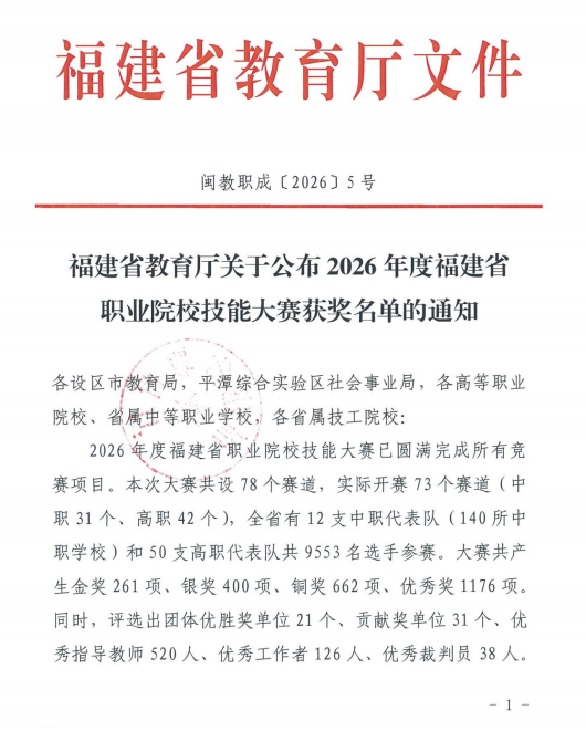 近日,福建省教育厅公布了2026年度全省职业院校技能大赛获奖名单。我院在本次大赛中表现突出,共组织14支参赛队伍参加9个赛项的角逐,经过激烈比拼,最终斩获金奖2项、银奖4项、铜奖6项,总计荣获12项省级奖项。余根景老师凭借在大赛组织工作中的突出贡献,荣获“优秀工作者”称号。