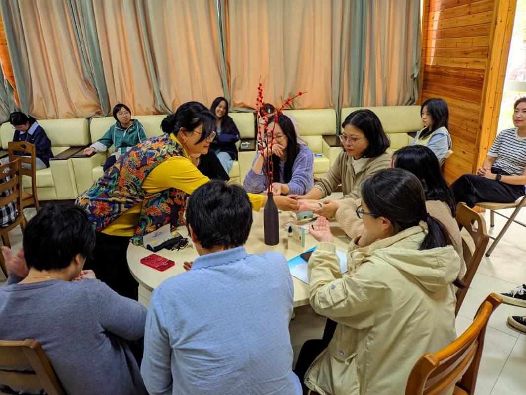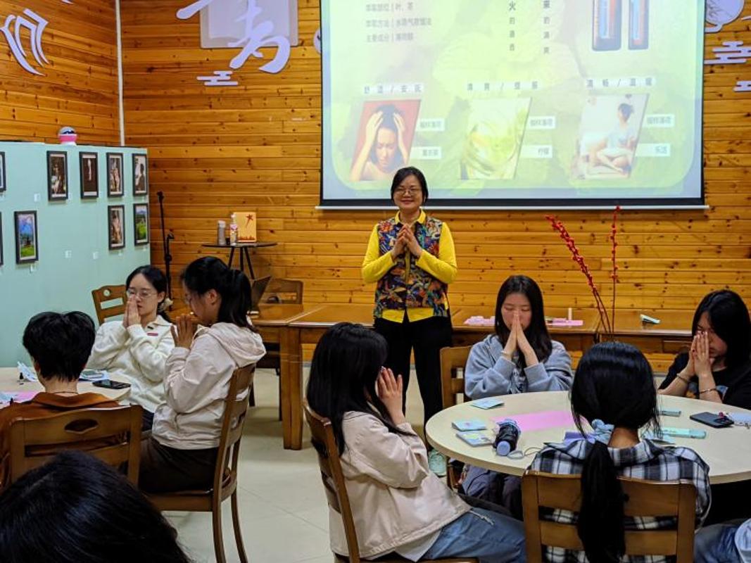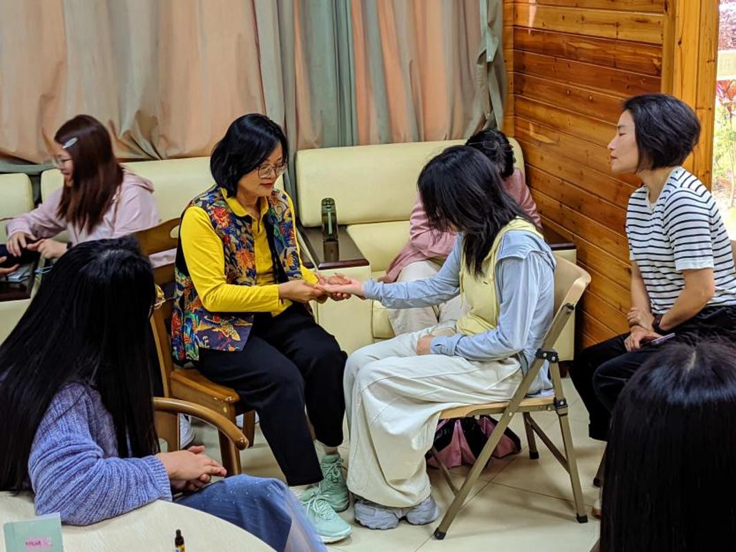 活动全程以沉浸式互动体验展开,从闻香静心签到入场,到呼吸冥想放松情绪,再到劳宫穴触觉激活、穴位按摩、精油涂抹实操,王芳老师手把手指导大家掌握劳宫穴摩擦生热、掌根相扣传递温感、合掌呼吸冥想等简易可操作的疗愈技巧,让大家直观感受精油 “皮肤 — 真皮层 — 血液循环” 的作用路径,在轻柔互动与温柔场域中,快速从拘谨走向舒展,真切体会植物芳香带来的身心滋养。