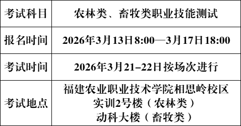考生务必携带身份证、准考证,自带黑色水笔或签字笔。根据《农林类、畜牧类考生须知》的时间安排,到福建农业职业技术学院首山校区(福州市仓山区上三路190号)统一乘车至相思岭校区,请考生务必准时到达指定地点;考后再分批乘车返回首山校区。